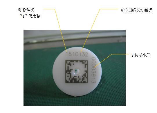 二維碼動物標識由二維碼和編碼兩個部分組成。二維碼采用加密技術(shù)的行業(yè)專用碼,具有防偽功能;編碼由動物種類+區(qū)劃編碼+標識順序號組成。如下圖所示(以豬耳標為例):